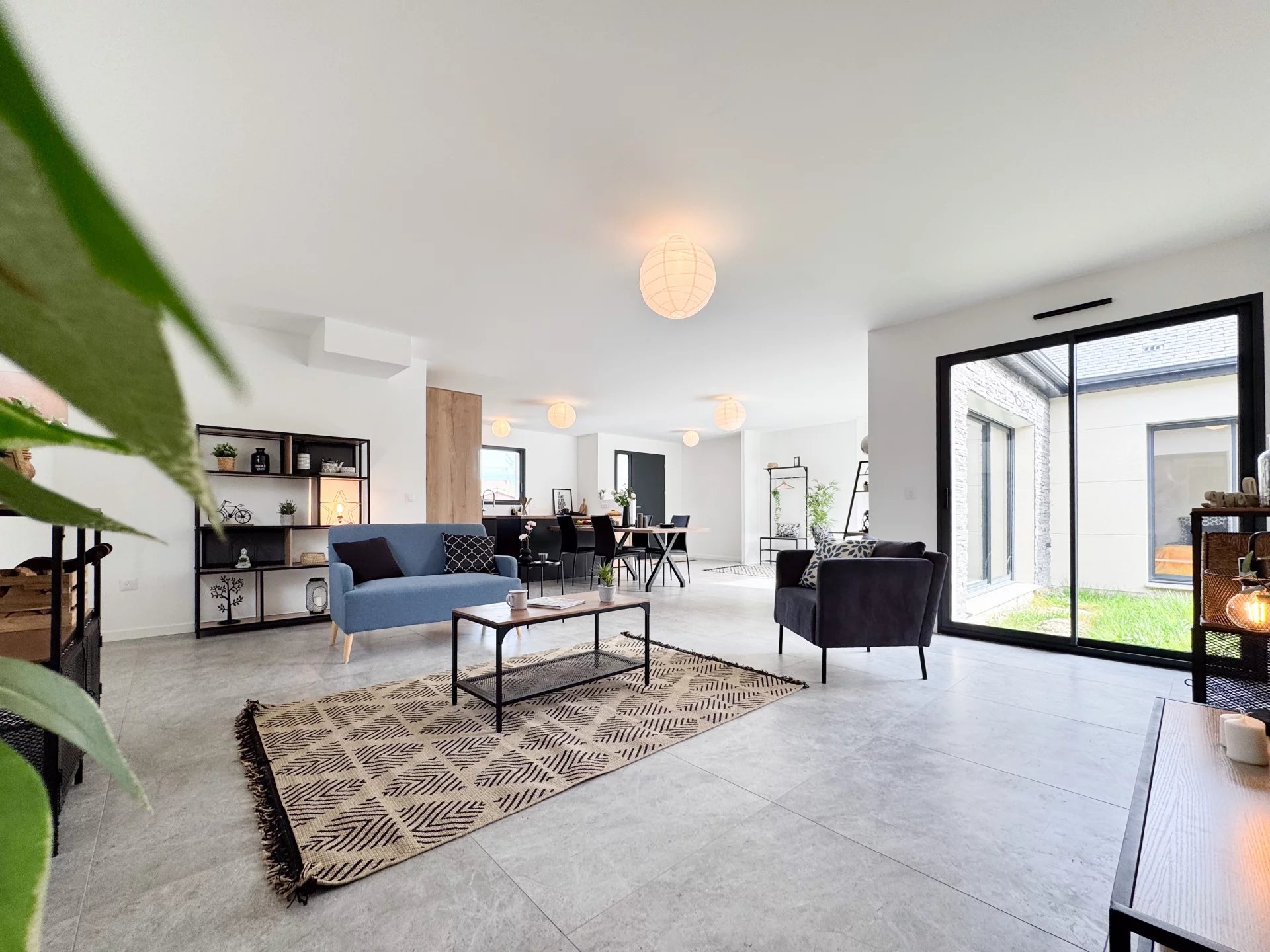 Dès l'entrée, vous serez charmé par la sensation d'espace et d'ouverture ainsi que les beaux matériaux qu'offrent cette maison. La cuisine équipée avec son « ilot central dînatoire » est totalement ouverte sur le vaste séjour doté d'un conduit prêt à accueillir un poêle pour réchauffer vos soirées. Les grandes baies vitrées baignent la pièce à vivre de lumière naturelle, renforçant l'impression d'espace qui caractérise la maison.