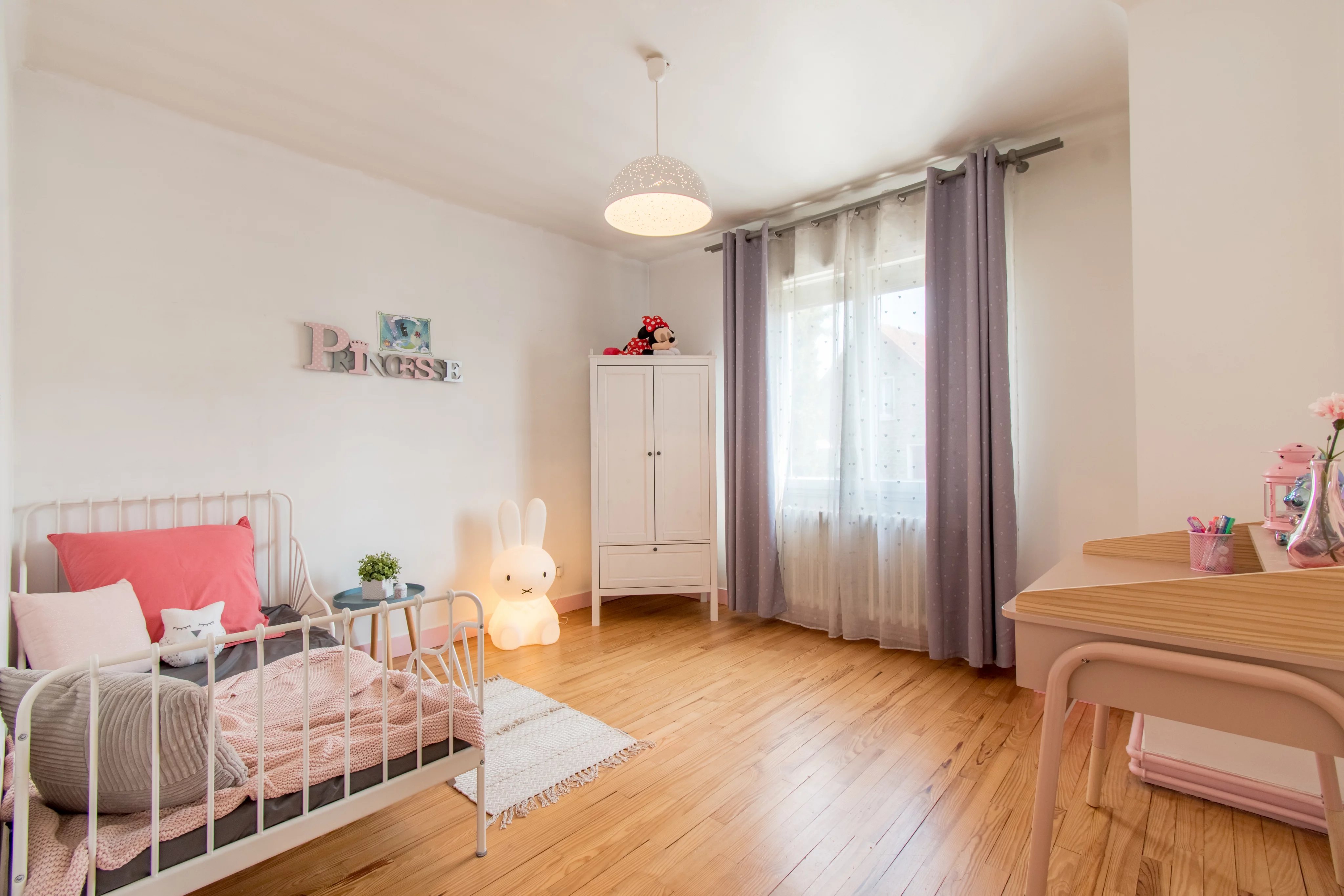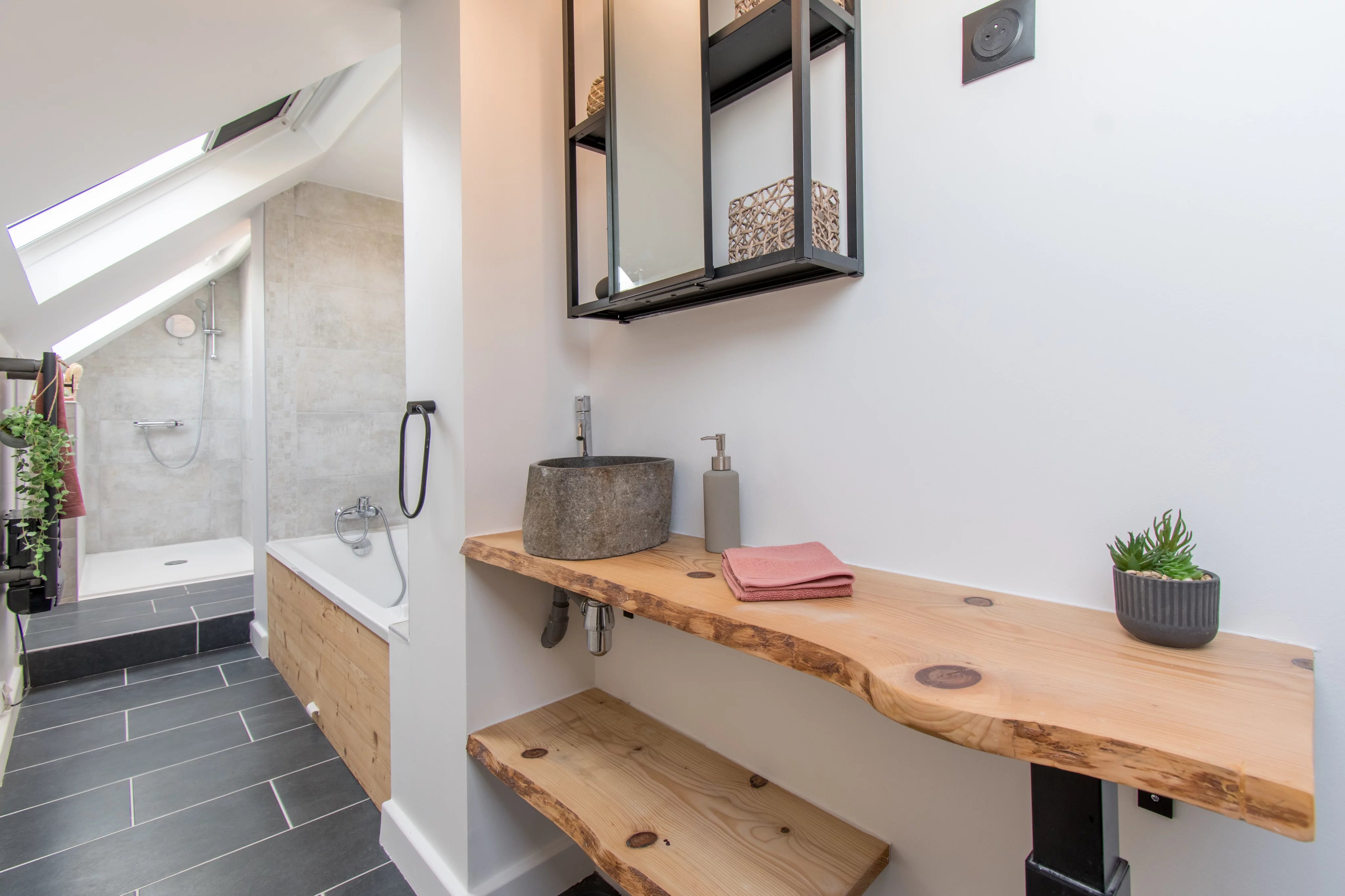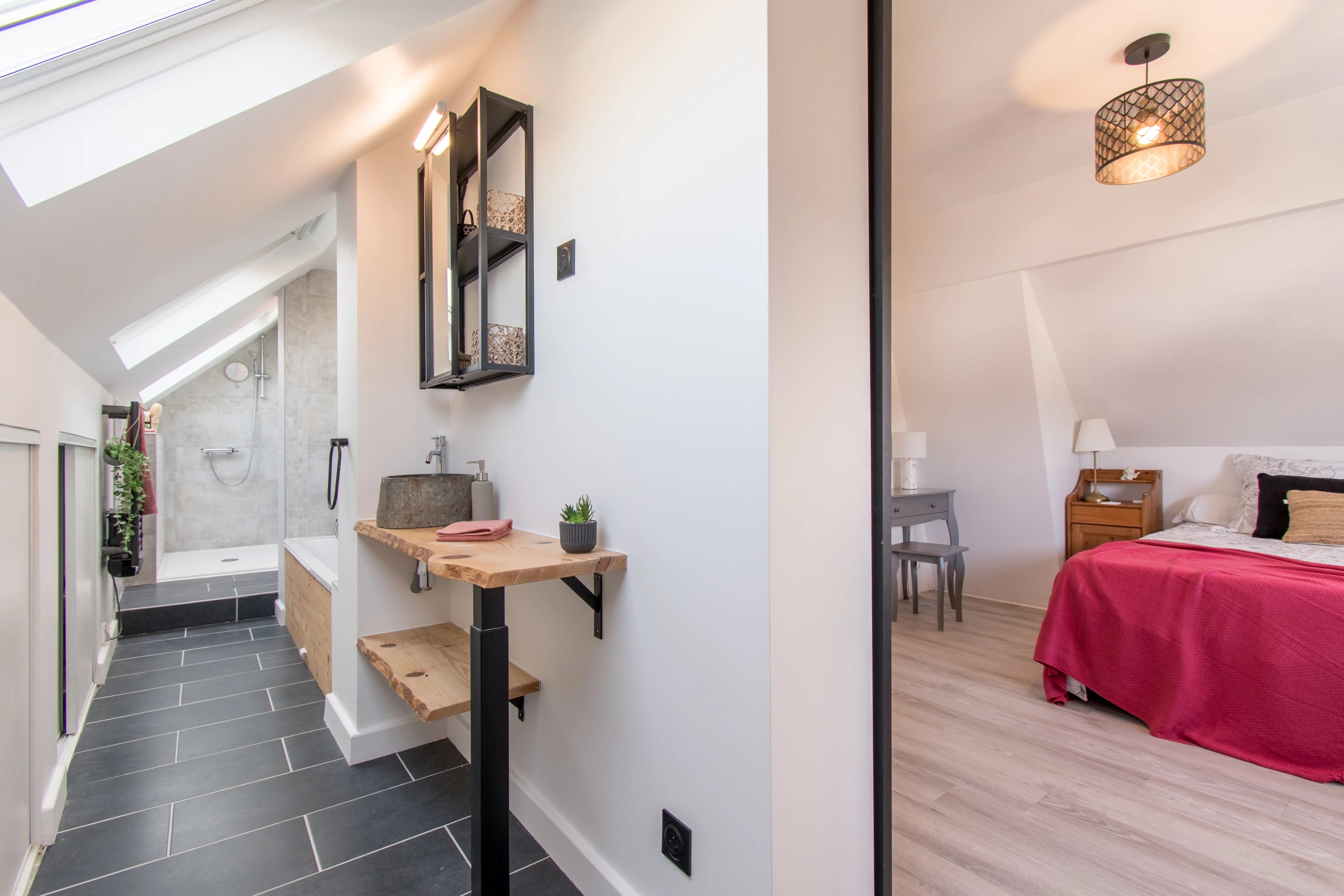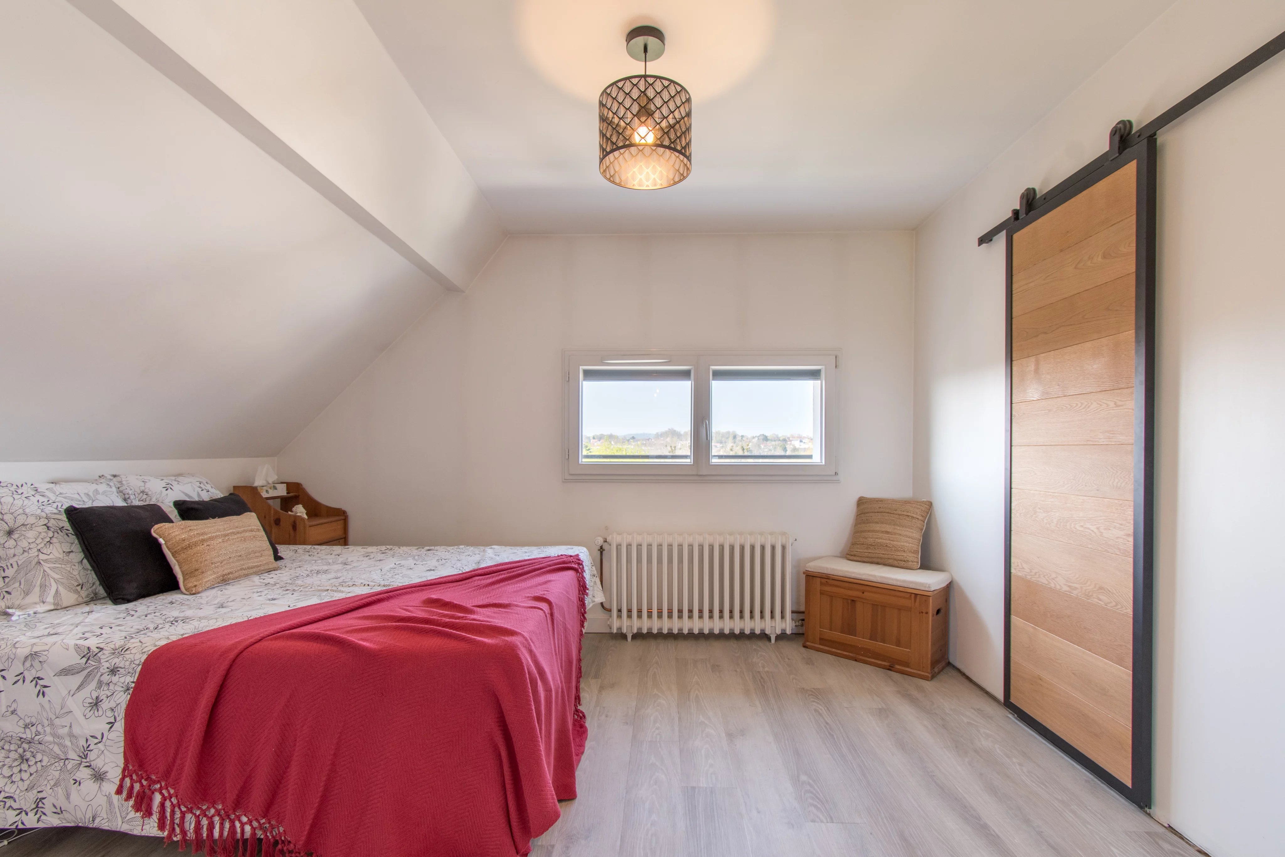 On aime la façon dont cette maison a été organisée, avec un étage dédié aux enfants, puis un dernier niveau réservé aux parents. La présence d’une chambre au rez-de-chaussée, aujourd’hui aménagée en bureau, apporte en plus une vraie souplesse d’usage. Mention spéciale pour l’espace parental du dernier étage, bien conçu et agréable à vivre, avec sa salle de bains sous pente particulièrement bien exploitée et sa vue dégagée depuis la chambre. Le sous-sol total et le grand jardin finissent de rendre l’ensemble particulièrement complet pour une vie de famille.