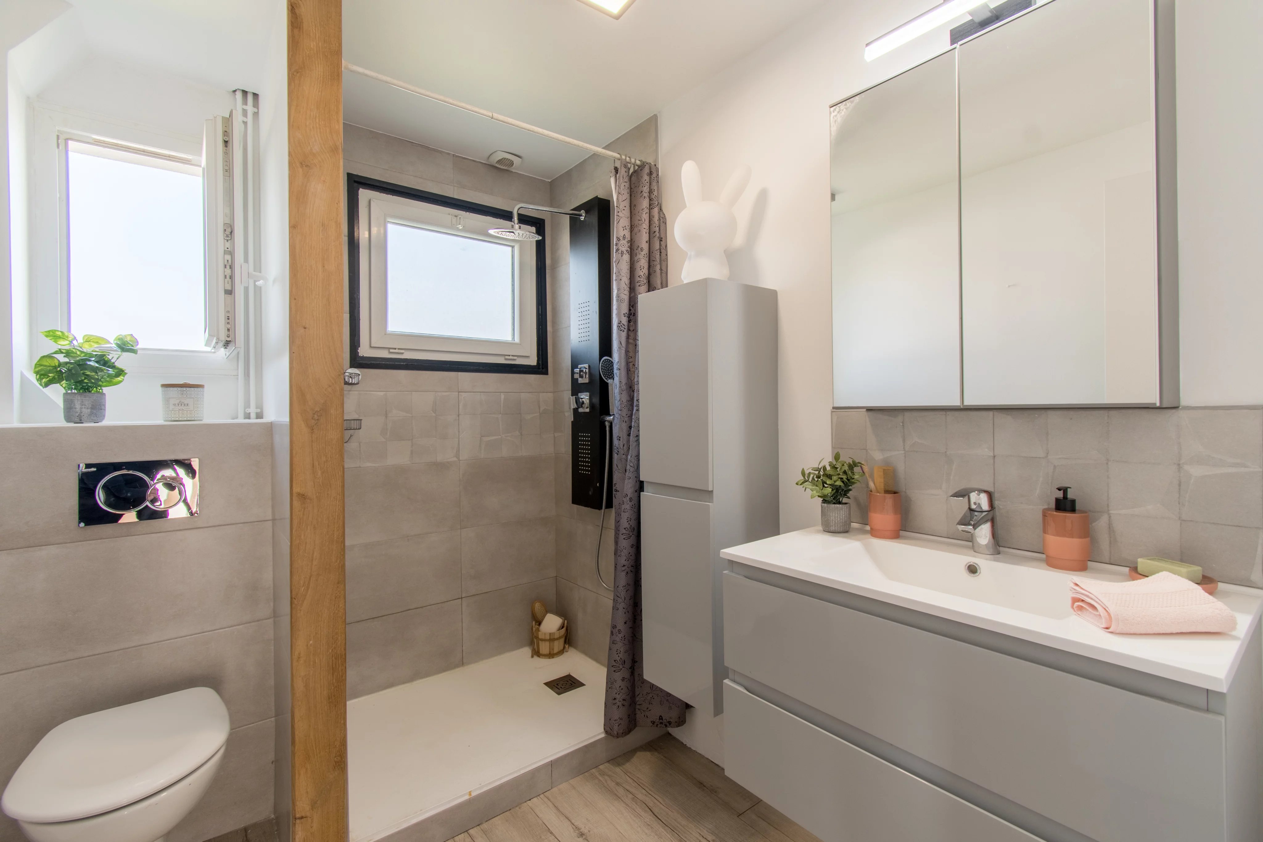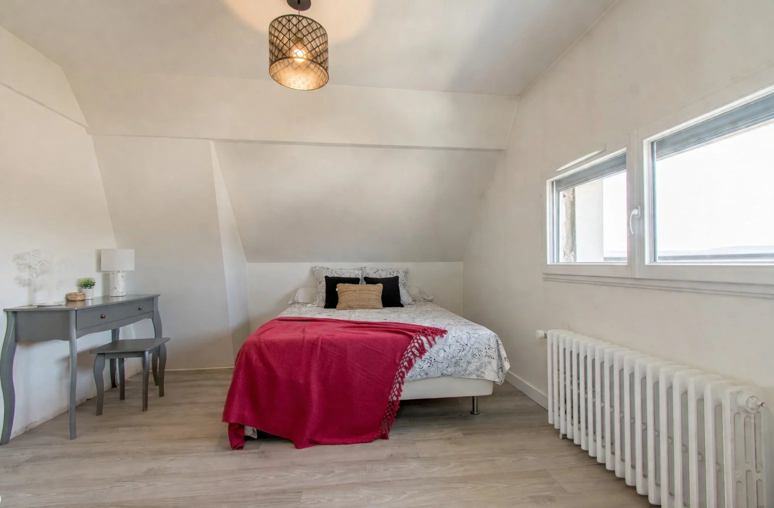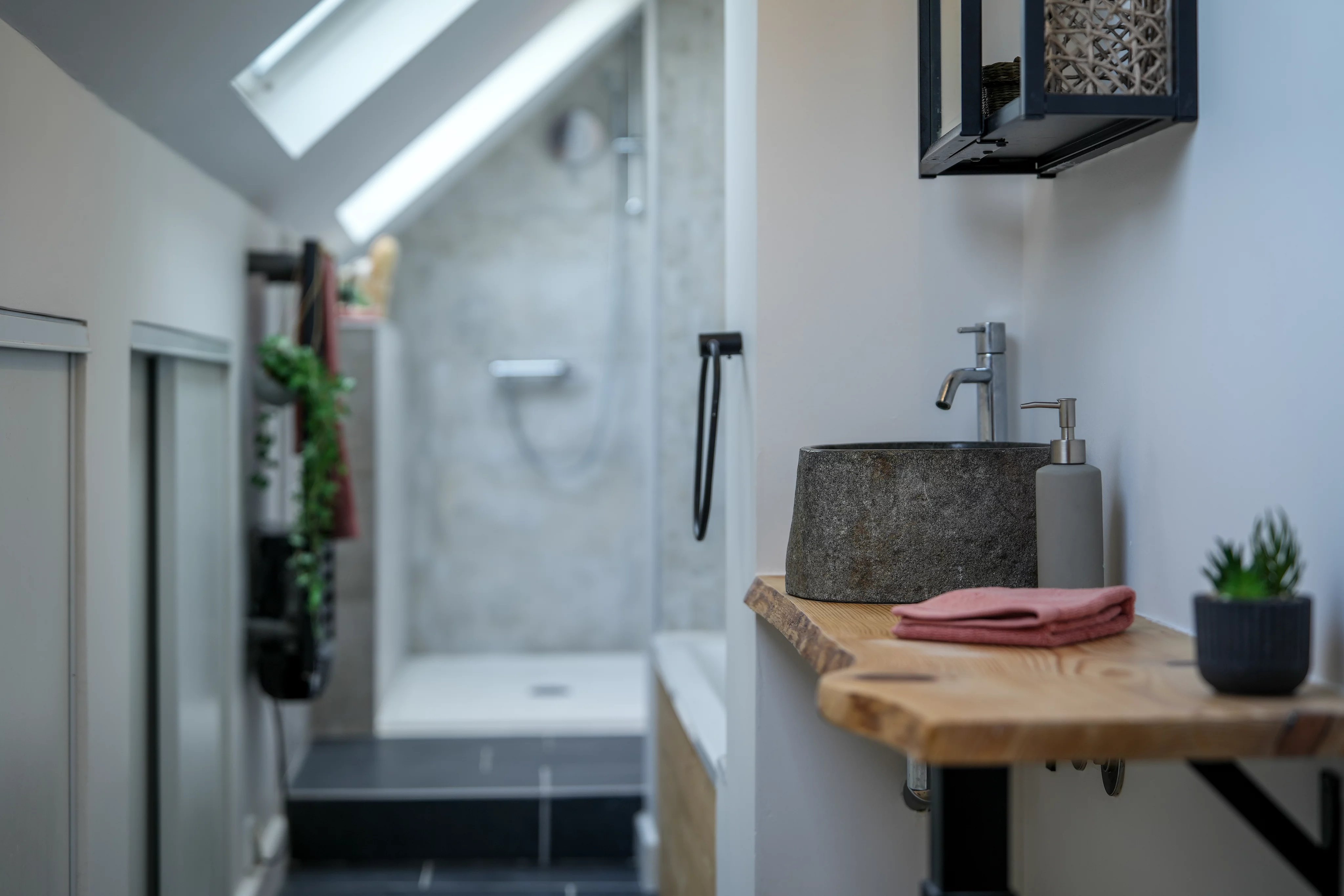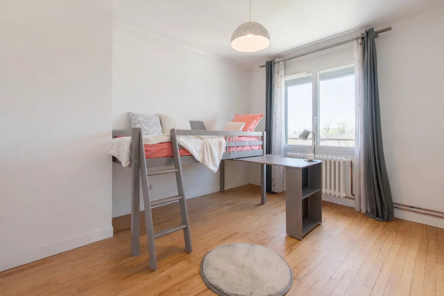 On aime la façon dont cette maison a été organisée, avec un étage dédié aux enfants, puis un dernier niveau réservé aux parents. La présence d’une chambre au rez-de-chaussée, aujourd’hui aménagée en bureau, apporte en plus une vraie souplesse d’usage. Mention spéciale pour l’espace parental du dernier étage, bien conçu et agréable à vivre, avec sa salle de bains sous pente particulièrement bien exploitée et sa vue dégagée depuis la chambre. Le sous-sol total et le grand jardin finissent de rendre l’ensemble particulièrement complet pour une vie de famille.